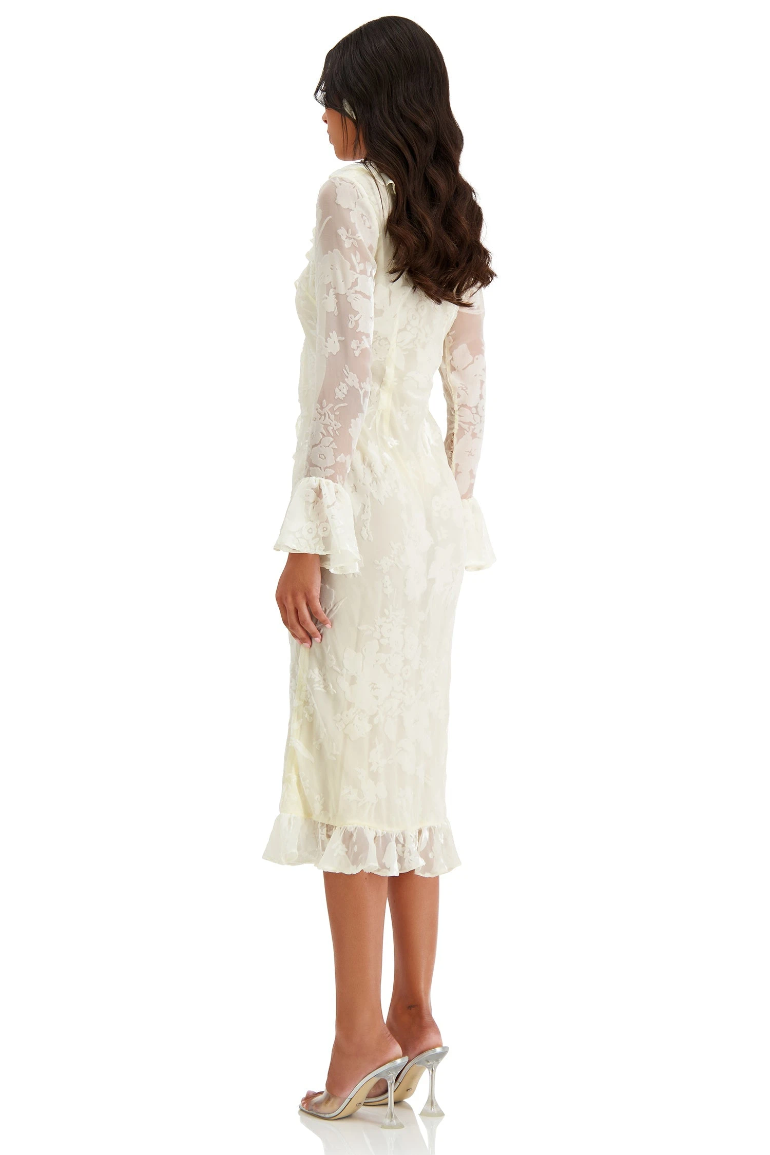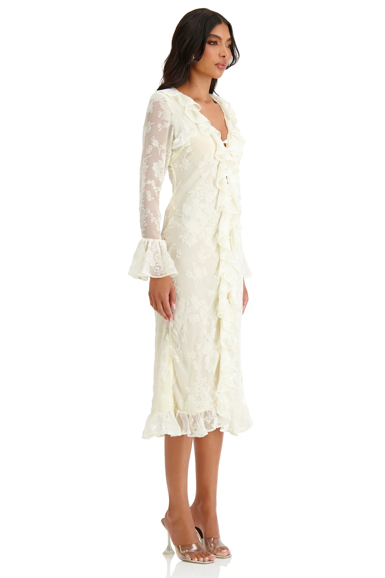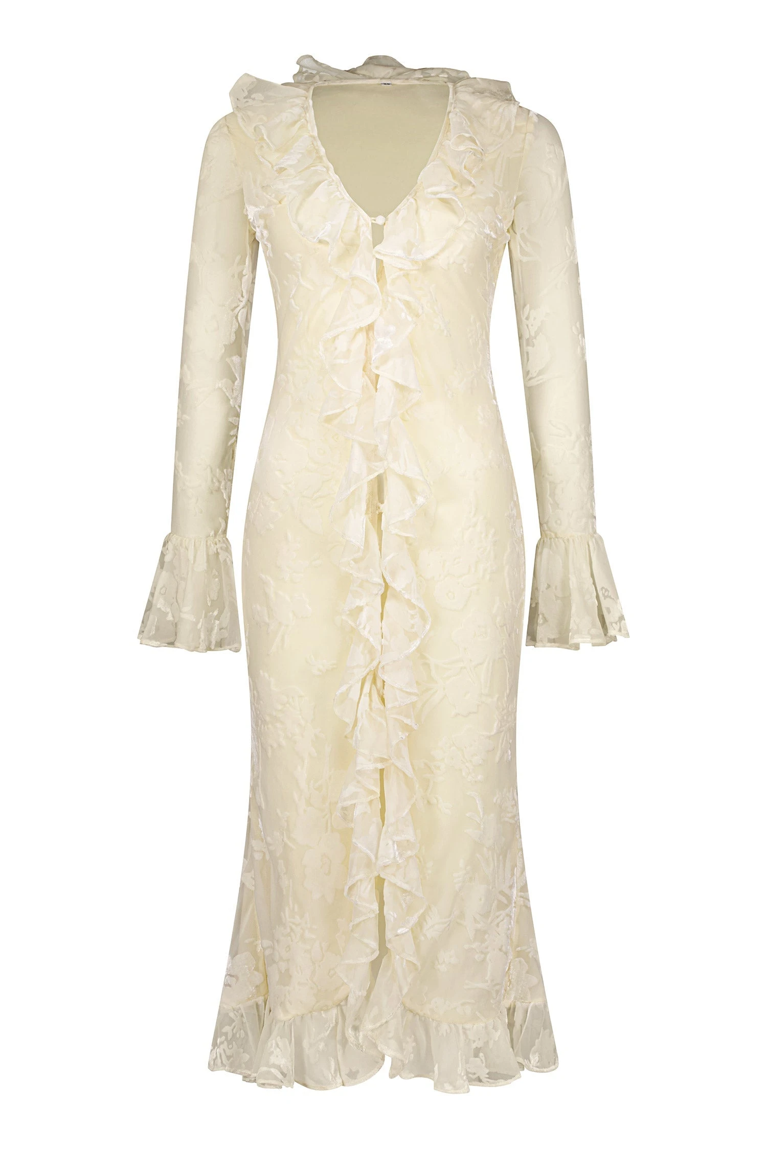 Meet the Barbarella Dress – a dreamy sheer long-sleeve dress adorned with ruffle details, crafted from premium floral devoré fabric, with 3D flower details strategically placed along the dress. The devoré technique, creates an intricate pattern of semi-transparent florals. Barbarella is a timeless and elegant piece, featuring ruffled trim along the closure, sheer long sleeves, and a flowy skirt, making it ideal for after-beach drinks, beach clubs, or wearing over a bikini.Â