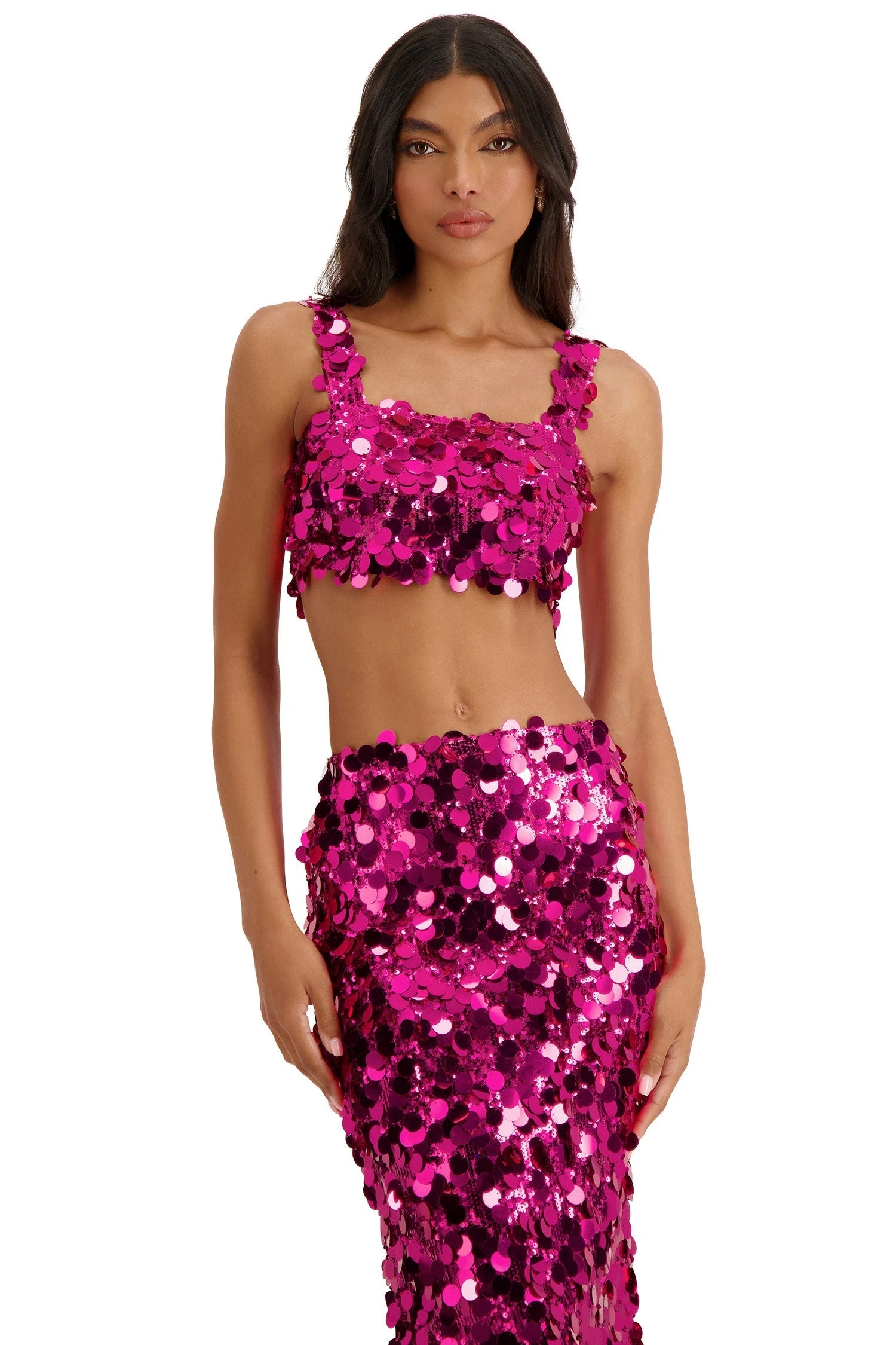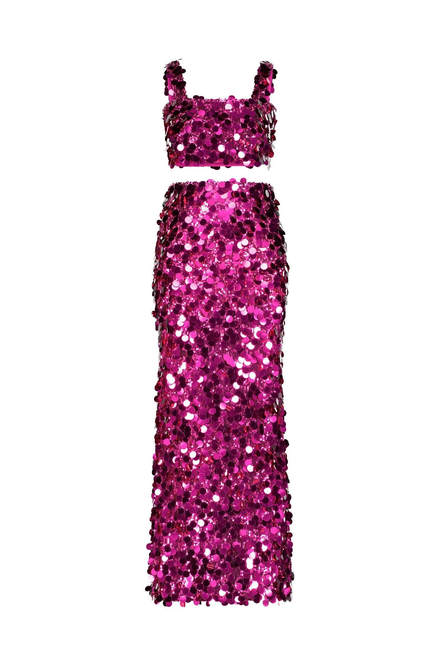 Benedeta Set – The Party Set of the season is here! A style guaranteed to make a statement. With its vibrant hot pink sequins and chic cropped top, this ensemble is party perfection. Flaunt your curves in the fitted pencil skirt and turn heads in the Benedeta Set at your next event. The ideal set for birthday parties, hens night, night out with the girls, beach clubs, rooftop bars.Â