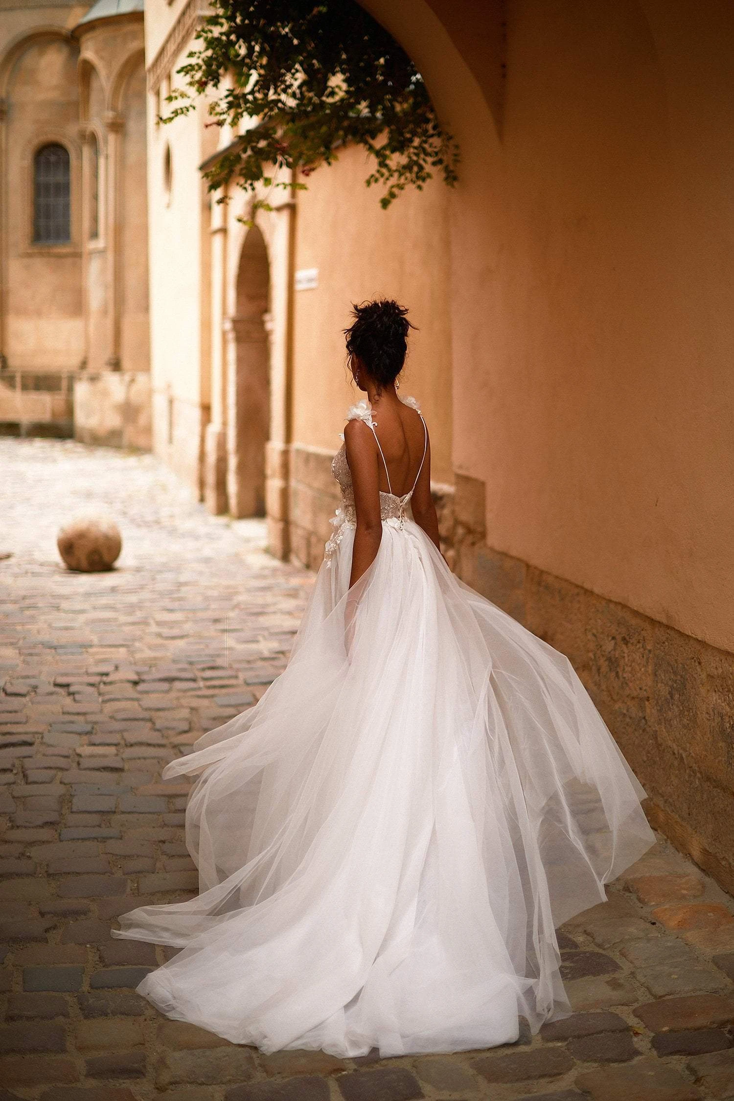 Glitter on bust (it will fall out and that’s normal), lace appliqué and layers of tulle, semi-sheer, no cups, lace-up back, non-adjustable straps, high slit on left leg, deep plunge neckline.