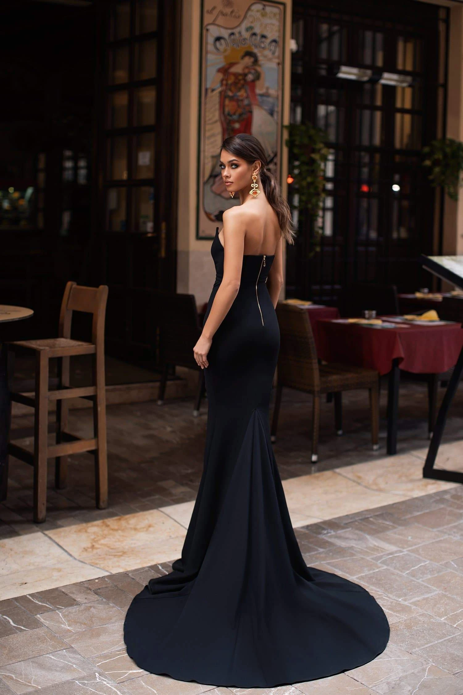 Sleek & stylish, the Gulsina Gown is a stunning black strapless mermaid gown with a train & flattering, on-trend scoop neckline. This gown hugs your figure &Â will make you look sexy & on-trend for your event. Made from stretchy crepe fabric & boning in the bustier.Â