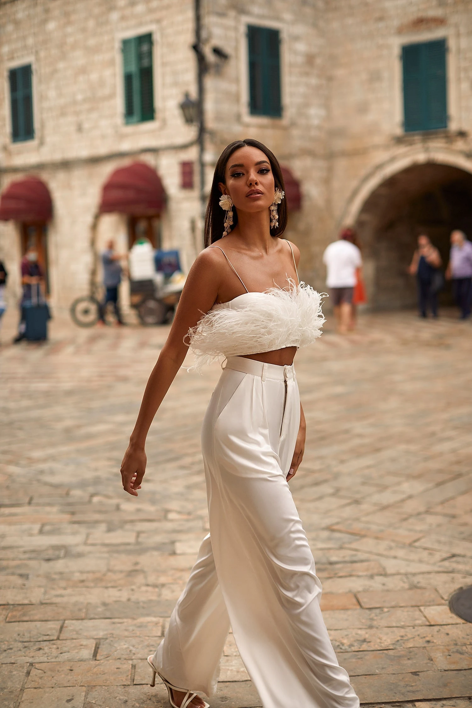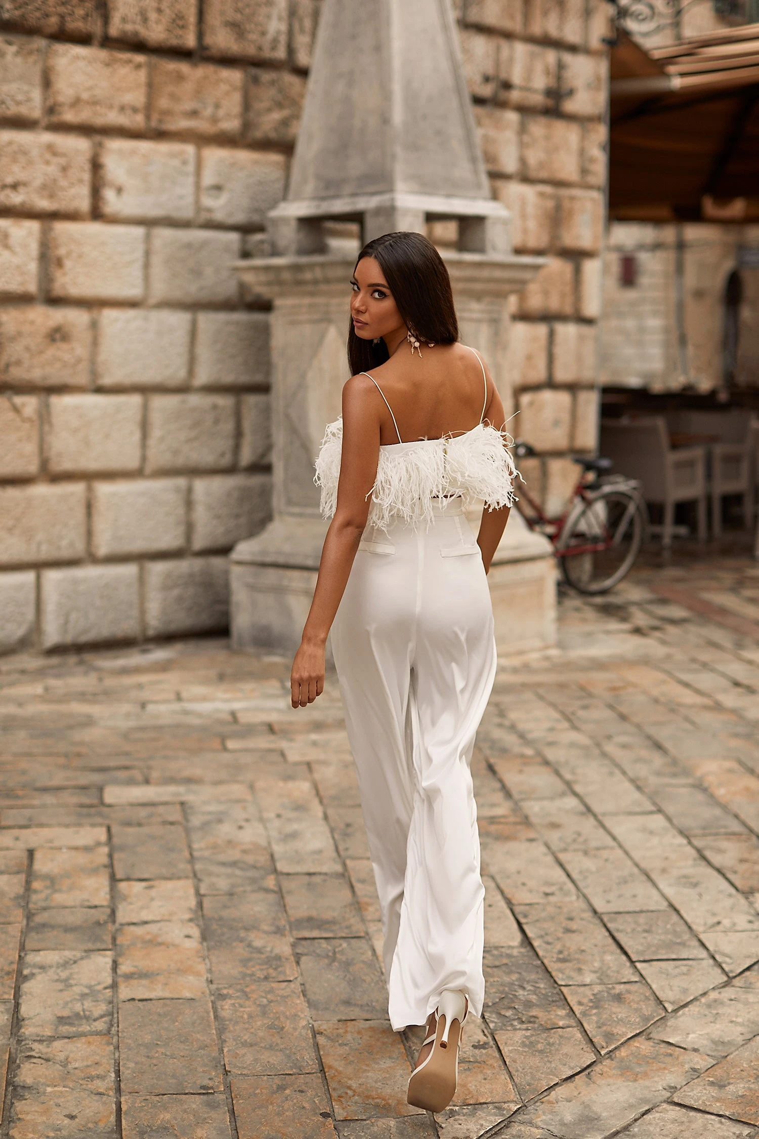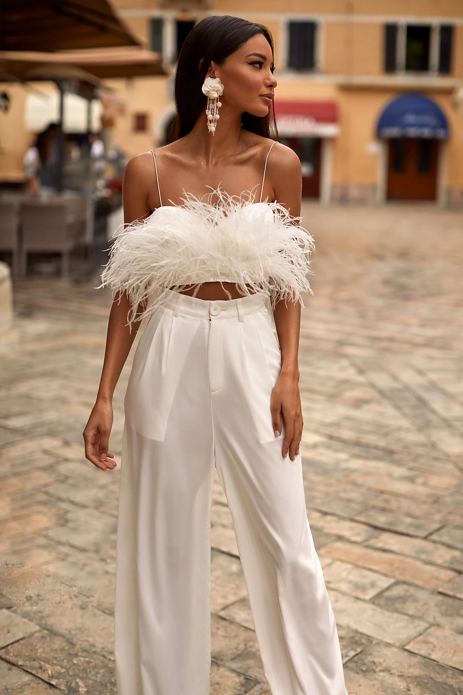 Modernise your style with the Hilma Set. Suspended from dainty straps, this feather crop is a season favourite. Paired with high-waisted palazzo-style pants, this set opts for a super chic look.