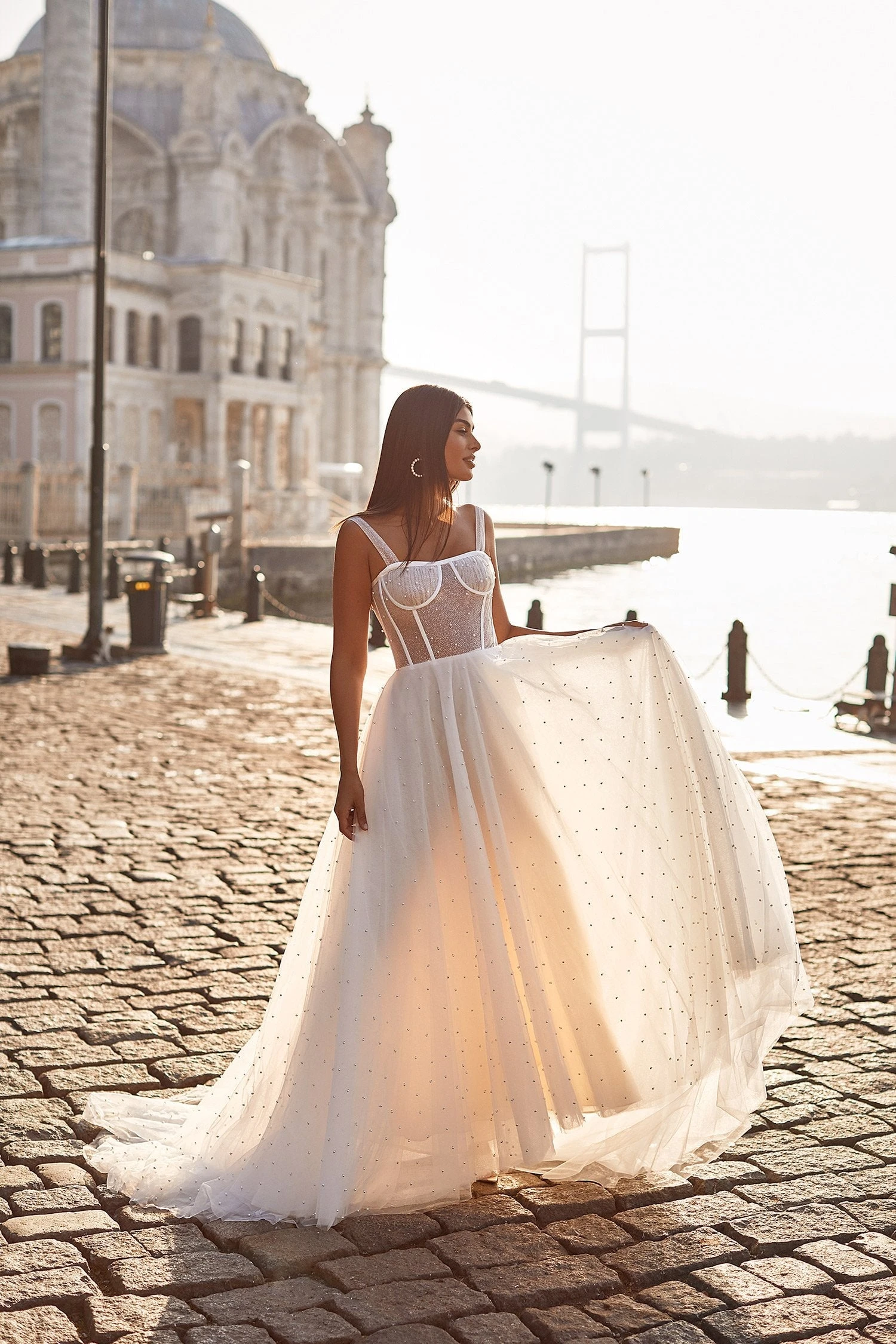 The Jubaila Gown is the perfect median for those brides that want a traditional look with added modern design elements. Rendered from a delicate tulle fabric adorned with pearls and adjusted with a lace-up back, these details bring out a conventional look for your special day while still adding the sheer bodice and ruched bust to accentuate the contemporary taste.
