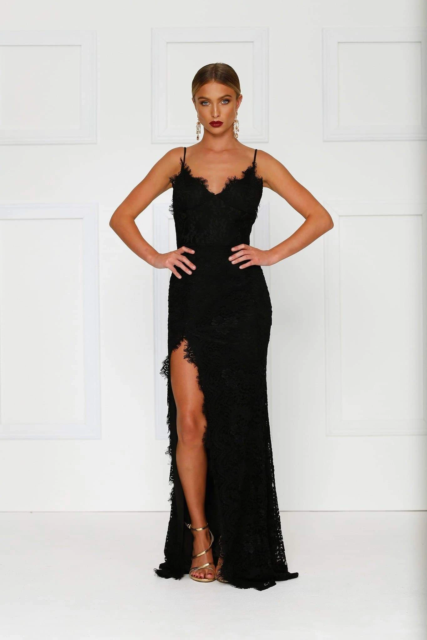 Make jaws drop in the Layali Gown. This intriguing number features scalloped lace detail all over, a v-neckline, low back, thin straps, flirty side slit and a floor length skirt with a long train. For your comfort padded cups and a centre back zip was included in the design.