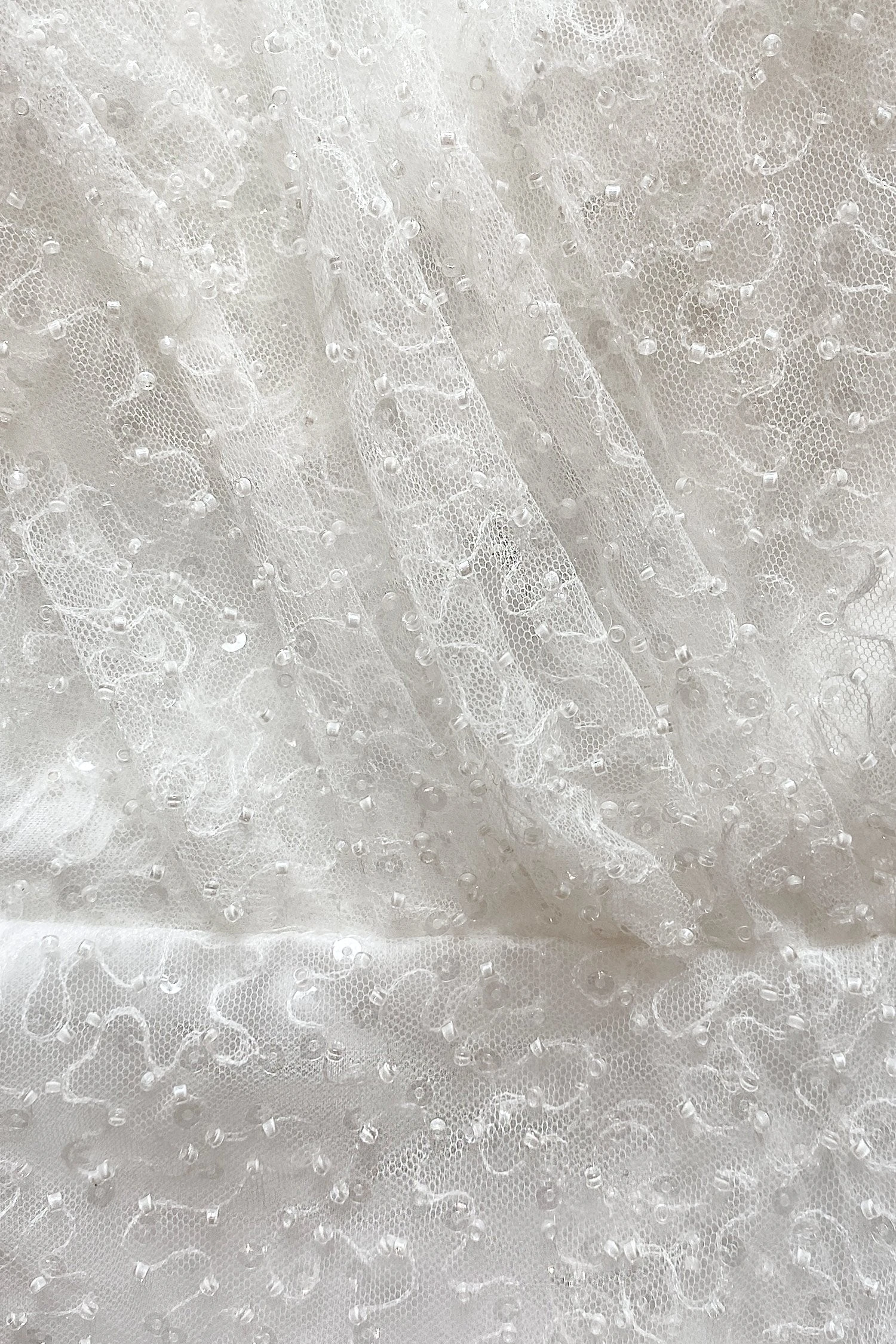 Leslie is comprised of a polyester underlay, sheer tulle layer & beaded delicate mesh top layer. Padded cups with boning. No stretch & non sheer. Left leg side slit.