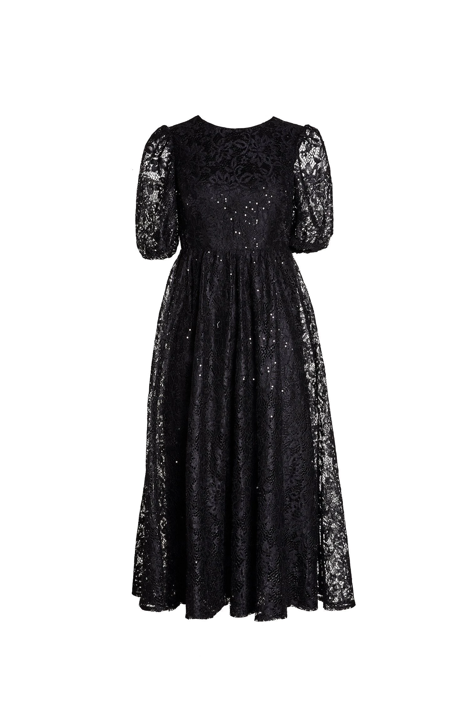 Timeless elegance meets chic glamour in the Manon Dress. Embellished with sequins, this black lace midi dress features a high neckline with semi-sheer peasant sleeves. Bringing a more contemporary appeal, the Manon Dress is elevated with its open, lace-up back. Fitted at the waist and the skirt falls effortlessly to below the knee.