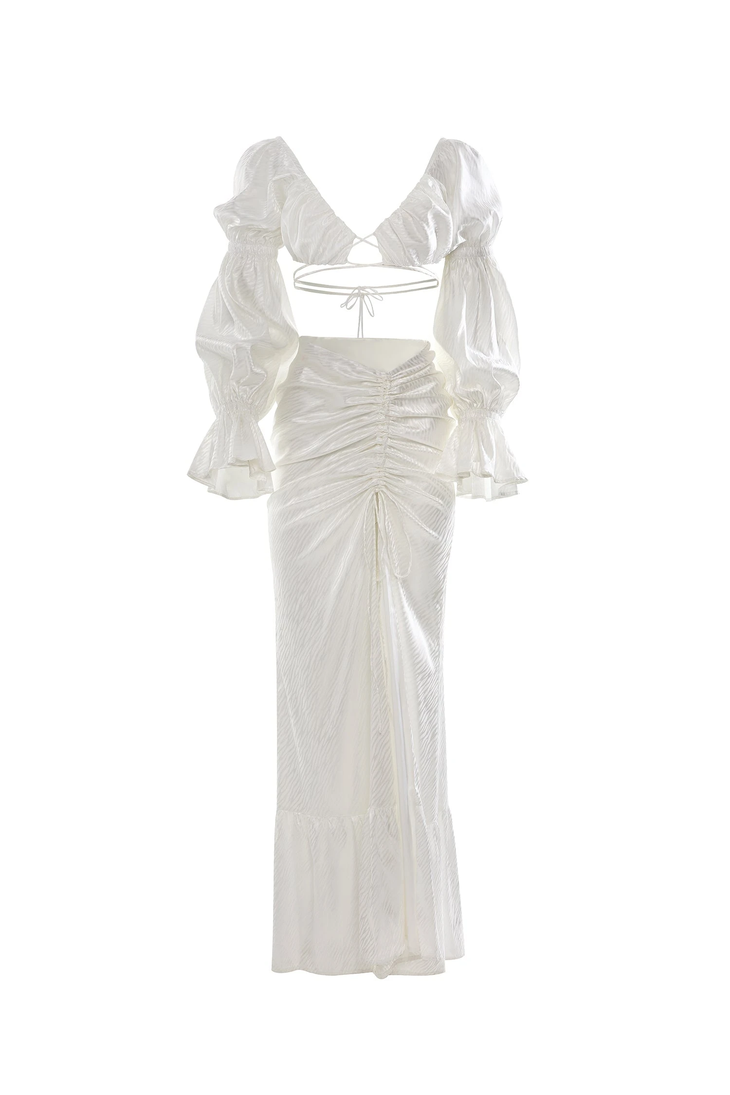 The Mays Set provides a modern take on resort styling with its two-piece design, off-shoulder crop with added waist ties, and floor-length maxi skirt. Fitted with an adjustable drawstring slit and rendered in a patterned satin fabric, this set will elevate your wardrobe.