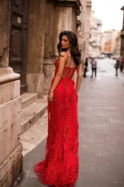 This modern two-piece design will captivate onlookers. Miya is made from silky red satin & features an asymmetrical one-shoulder long flare sleeve with ruched detailing on the back skirt.
