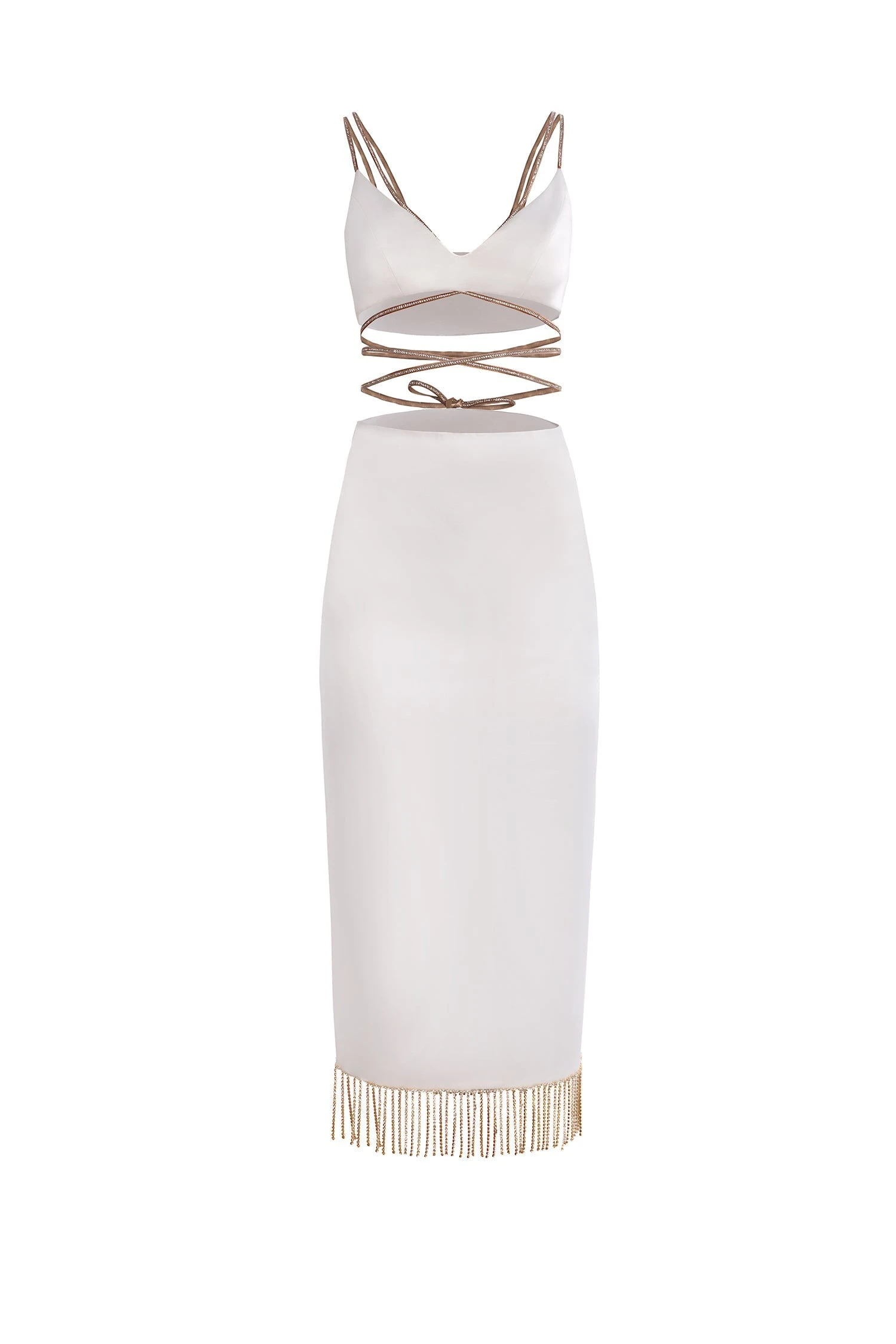 The Niala Set embodies sensuality. Featuring an exposed midriff that features diamante embellished ties that wrap along the waist, a fitted skirt, and a diamante fringe trim along the hem. This style exceeds all expectations with each luxurious detail.