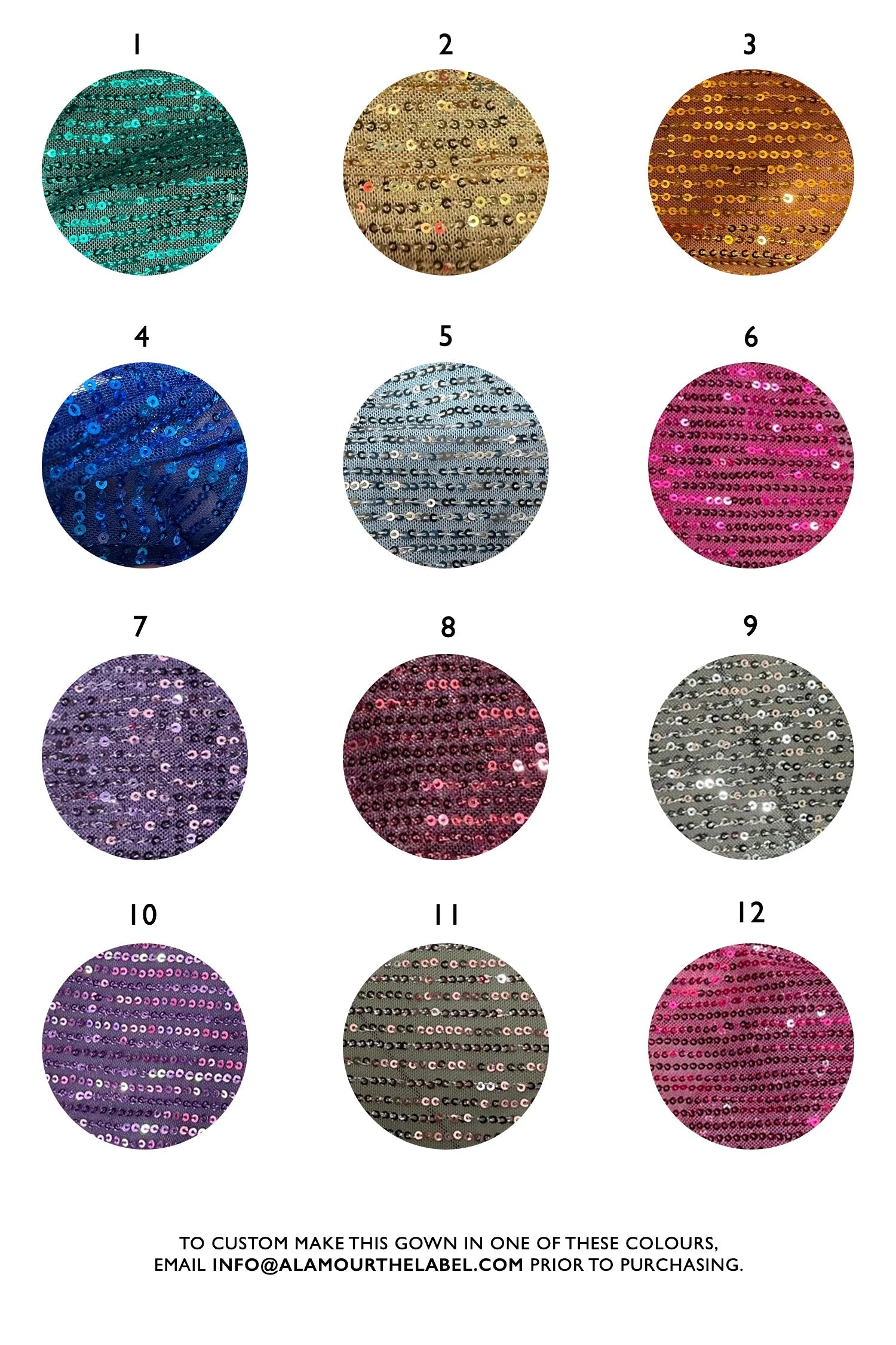 Introducing the party dress of the season! The Nina gown is the must have gown for formal and prom 2025. Nina is made from a sequined stretchy fabric, made after our best selling style, the Lendina. Nina features a round neckline and has a low back with ruching detail and mermaid skirt.Â