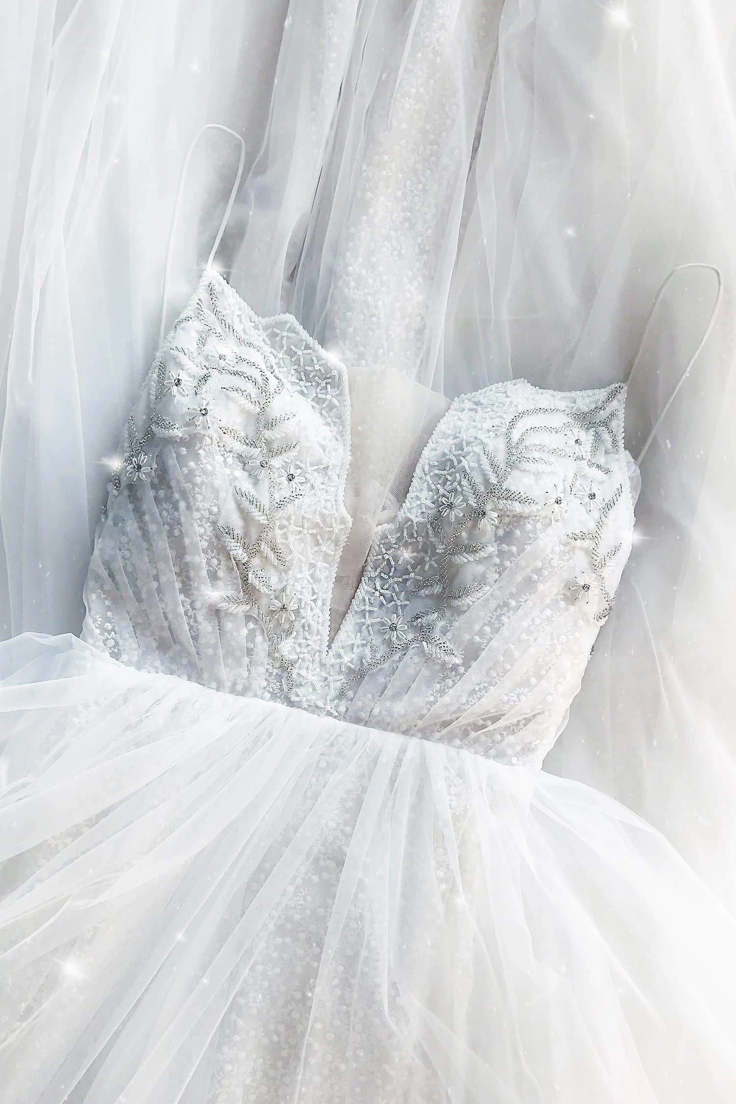 The Paisley Gown is breathtakingly beautiful, features a luxurious beaded bodice with unique cut-out mesh detailing and thin straps. The delicate skirt is made from layers of tulle and textured lace for a dreamy gown you’ll never want to take off.