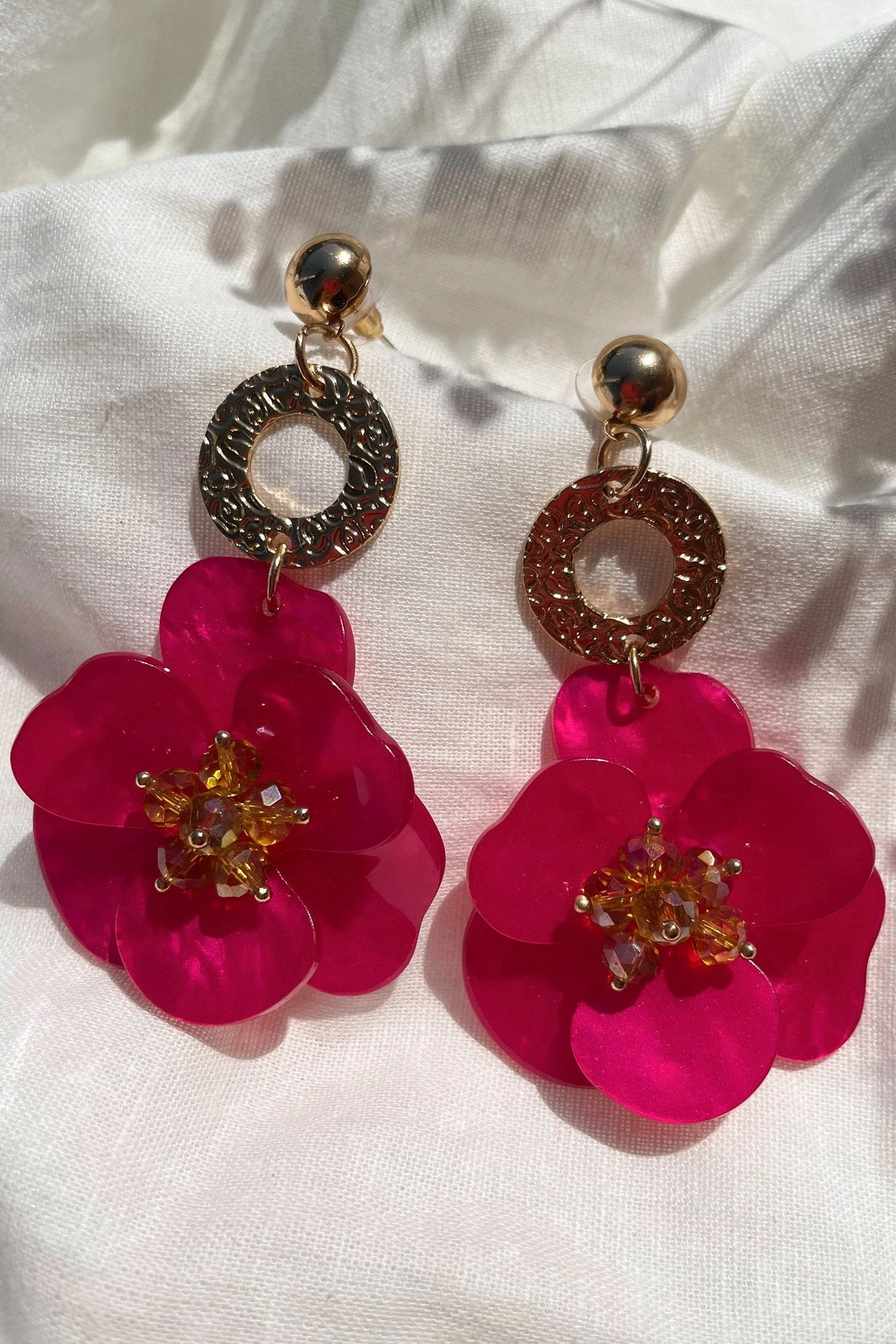 The Petra Magenta Flower Drop Earrings will pair perfectly with your resort wear. Crafted from an acrylic material in a magenta hue and elevated with an amber-colored center. These gold studded flower earrings will tie your spring wardrobe together.