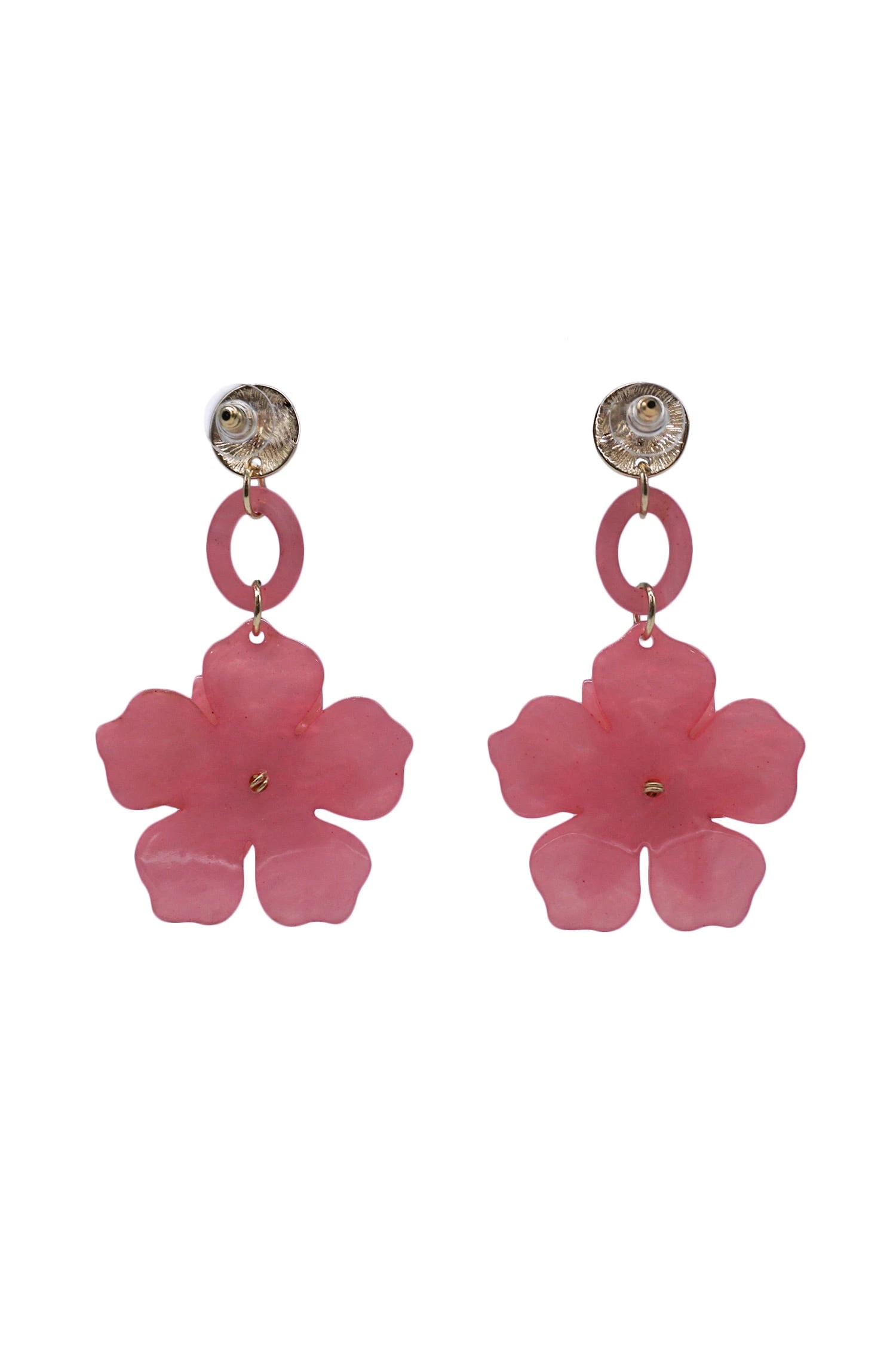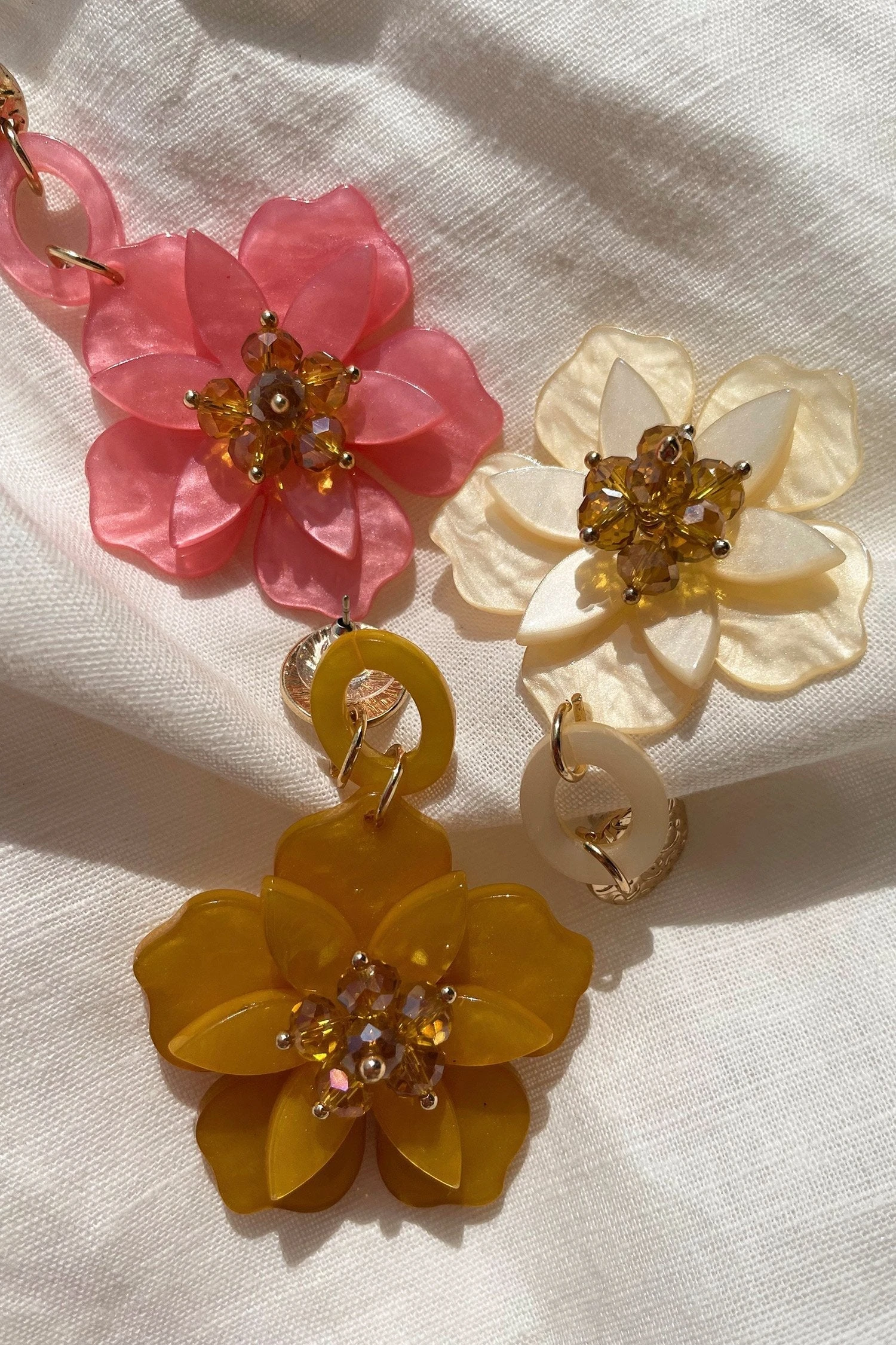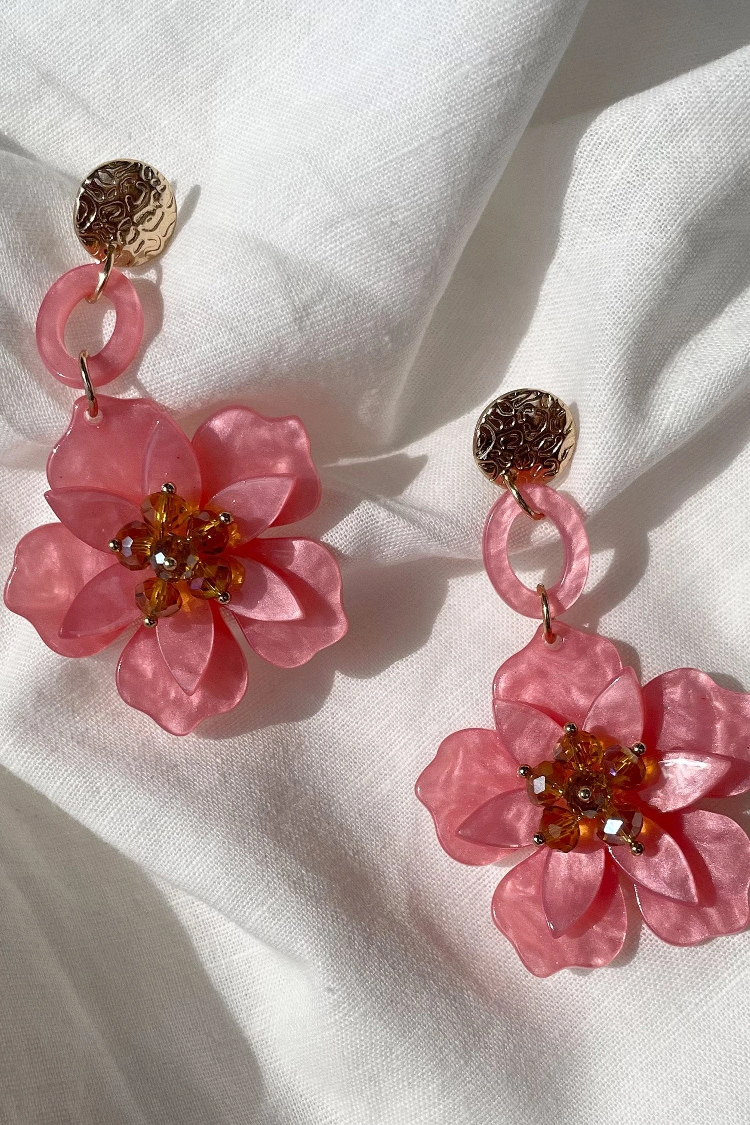 The Petra Rose Flower Drop Earrings will pair perfectly with your resort wear. Crafted from an acrylic material in a rose-pink hue and elevated with an amber-colored center. These gold studded flower earrings will tie your spring wardrobe together.