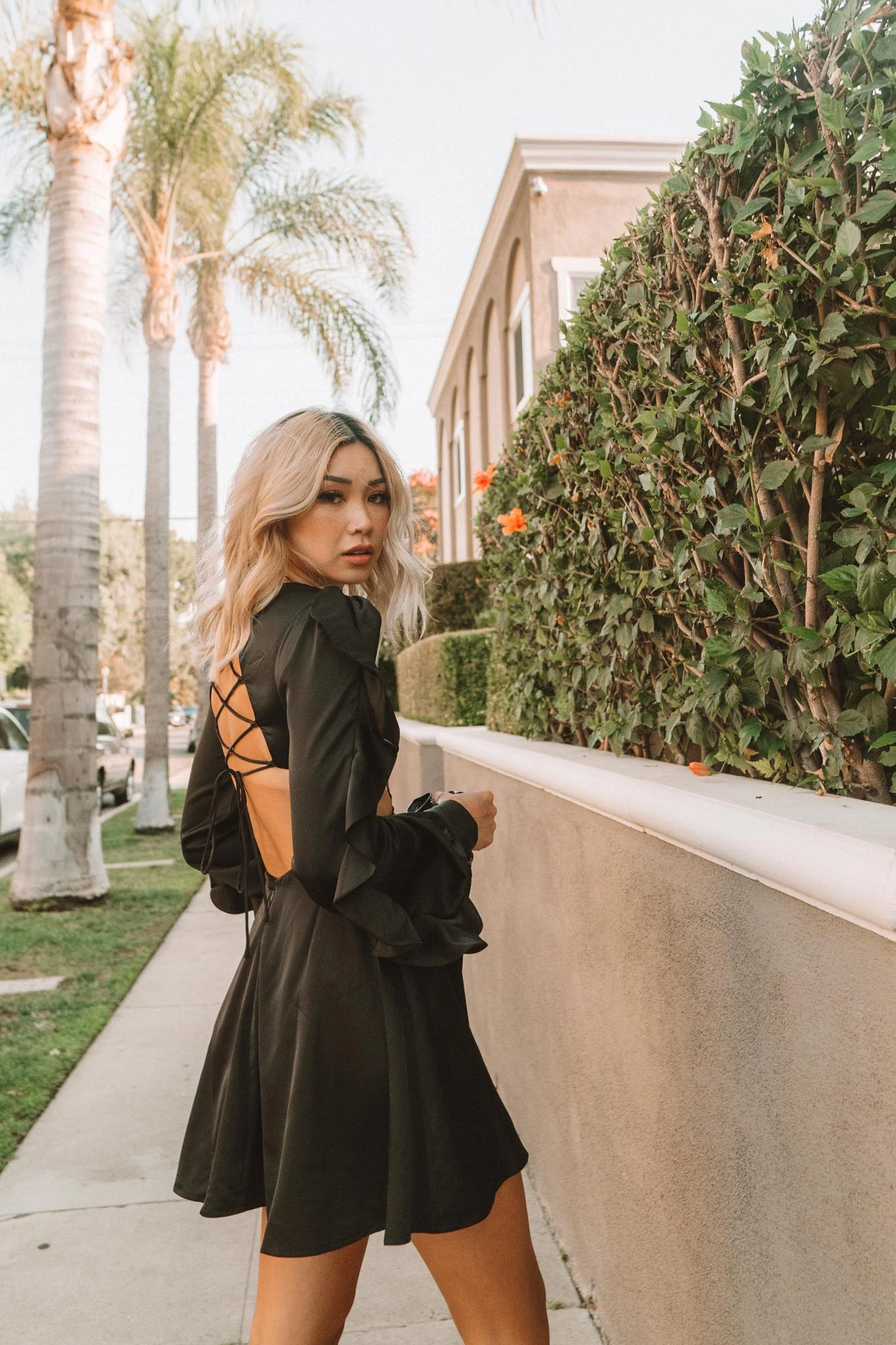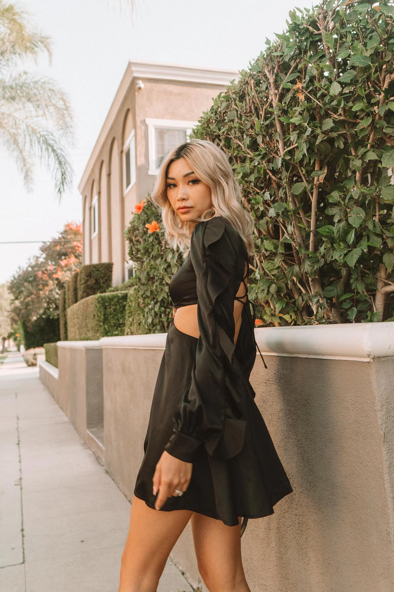 Alluring and ultra-feminine. The Romy Dress adds a flirty finish to your staple LBD. Designed with a lace-up back, side cut-outs to enhance your waistline, and our signature emblem piece. This mini dress was made to be shown off.Â