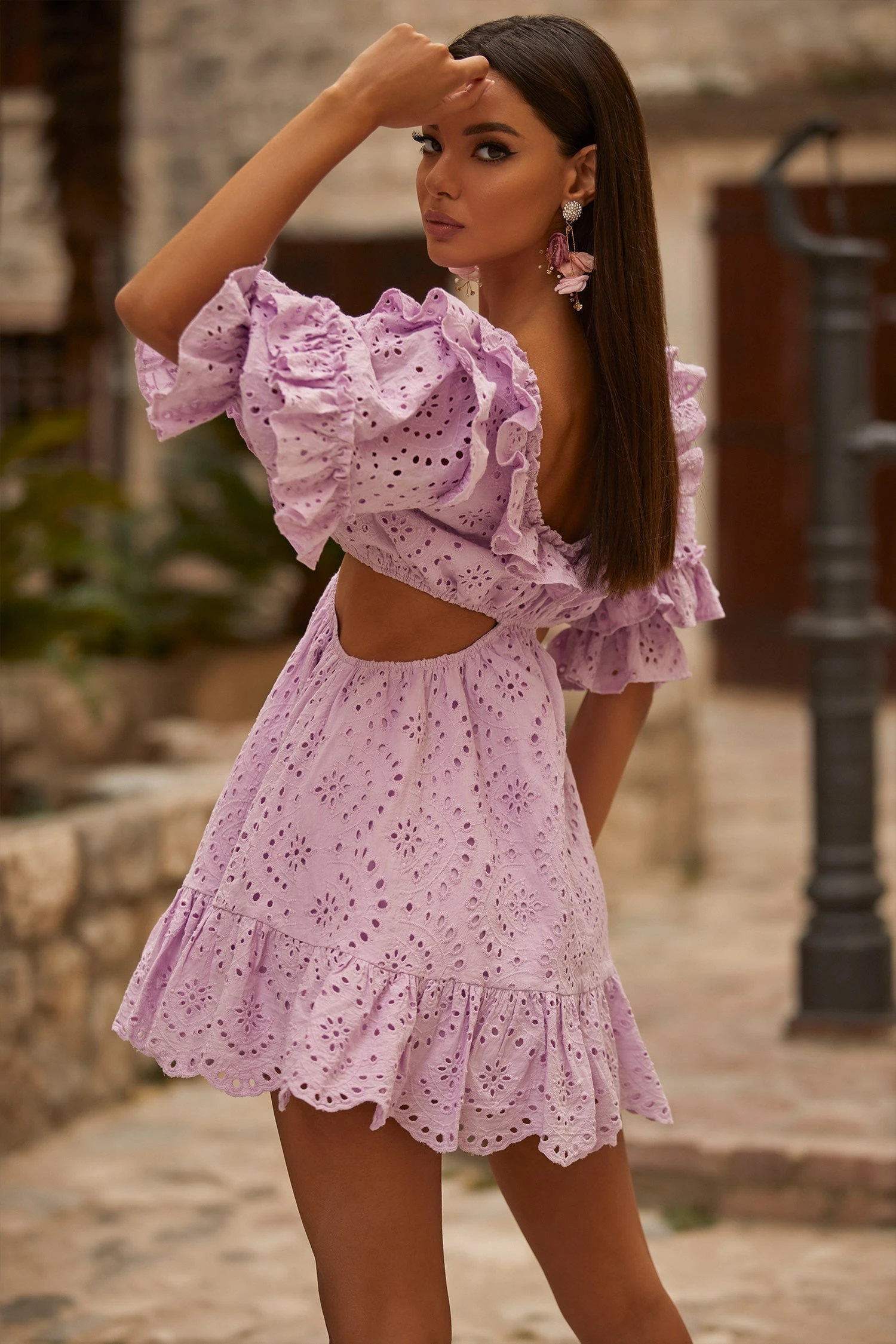 Allow your feminine side to take the forefront of your look in the Roselle Dress. Accented with frill trims and a scalloped hem, this lilac mini dress provides versatility with its sleeves that can be styled on or off the shoulder. Crafted in a luxe San Gallo lace fabric and elevated with its side cutouts and voluminous a-line skirt. The Roselle Dress has an abundance of feminine details that will find you choosing it over and over again.