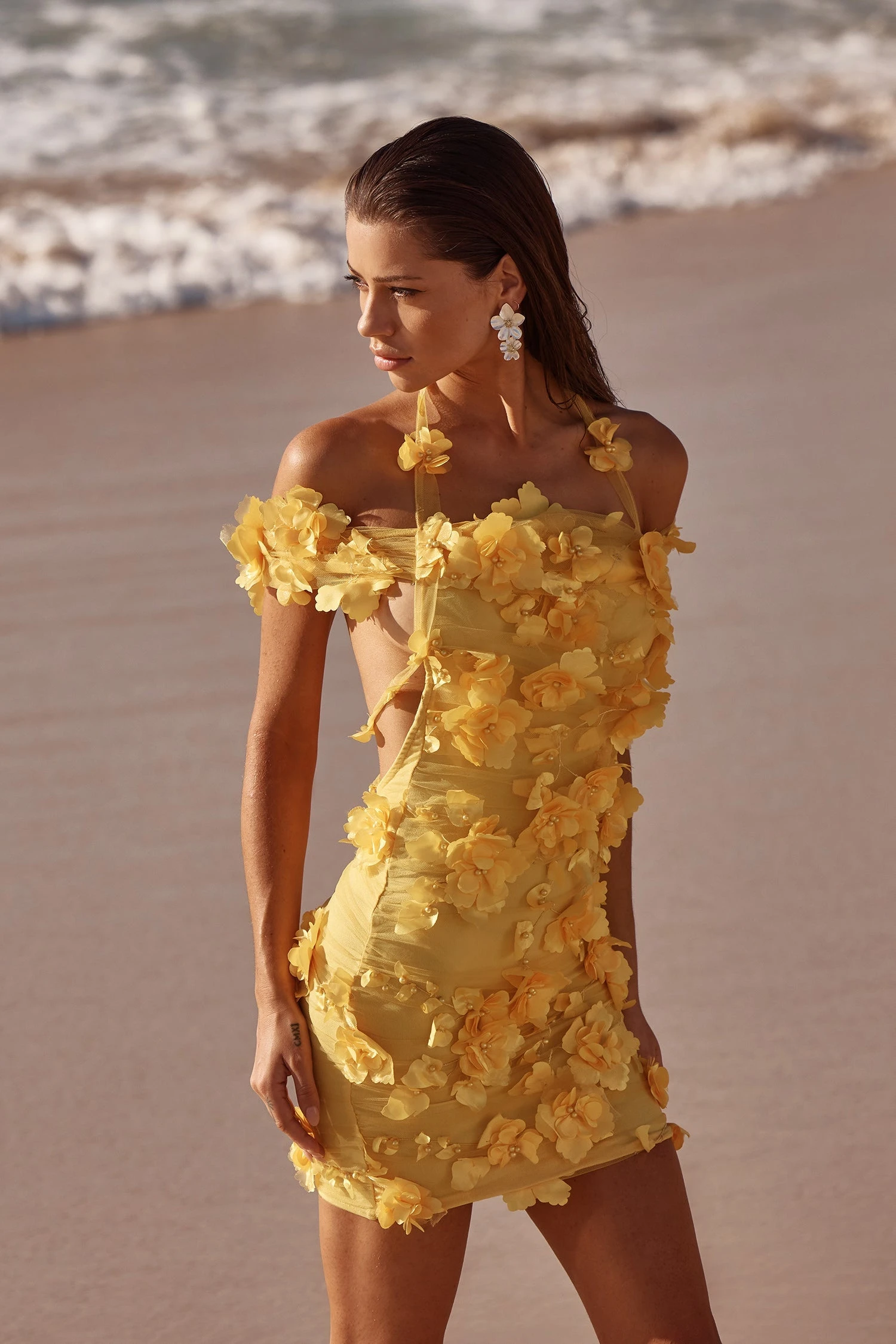 Meet the Ruby Dress – summer’s newest must have! This mini dress is guaranteed to make a statement. With its vibrant yellow colour made from our signature floral 3D fabric, this ensemble is perfect to dazzle the crowds in. Featuring a halter neckline, non stretch fabric and side bodice exposure, accentuating your curves. This beautiful set is perfect for birthday parties, hens night, night out with the girls, beach clubs, rooftop bars.
