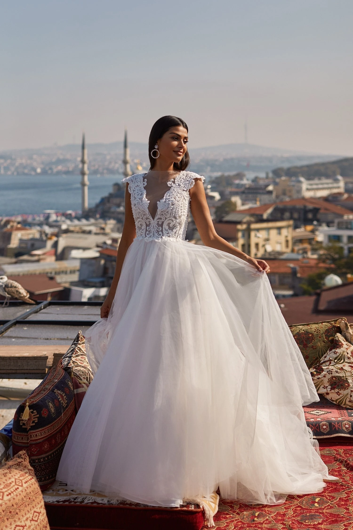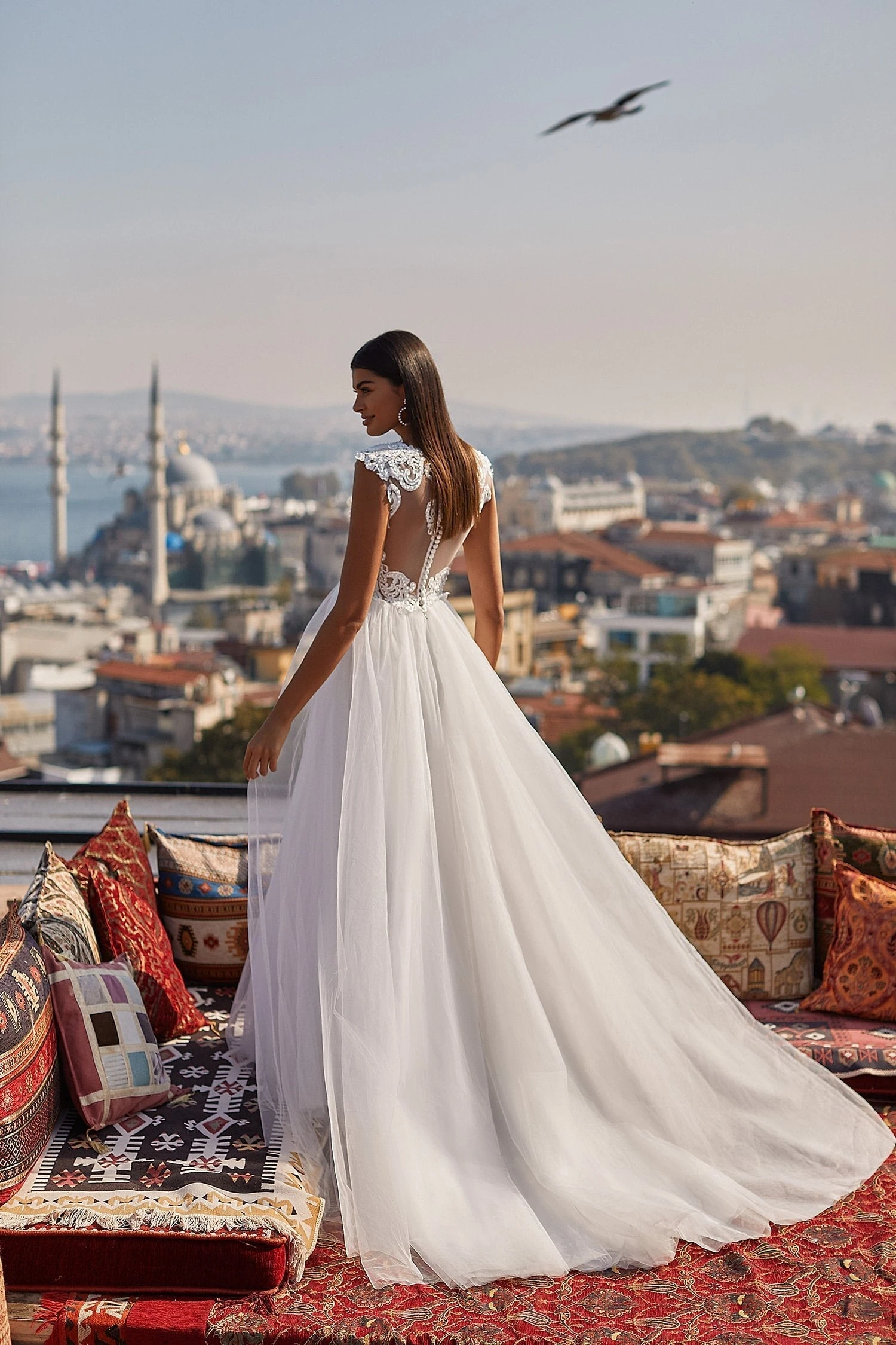 A timeless classic with updated design elements, the Sefa Gown has the perfect combination of both traditional and modern features. Made with sweet cap sleeves, a low-v neckline, and a sheer nude back with button details. The A-line silhouette and tulle skirt bring the look together for the sweetest bridal look.