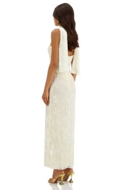 Our feminine outlook is materialized with the Serafina Midi Dress. Crafted from an embroidered floral fabric and elevated with its semi-sheer bishop sleeves, structured bodice, and a-line silhouette. The Serafina Dress is highlighted with our favourite lace-up back design, so romantic.