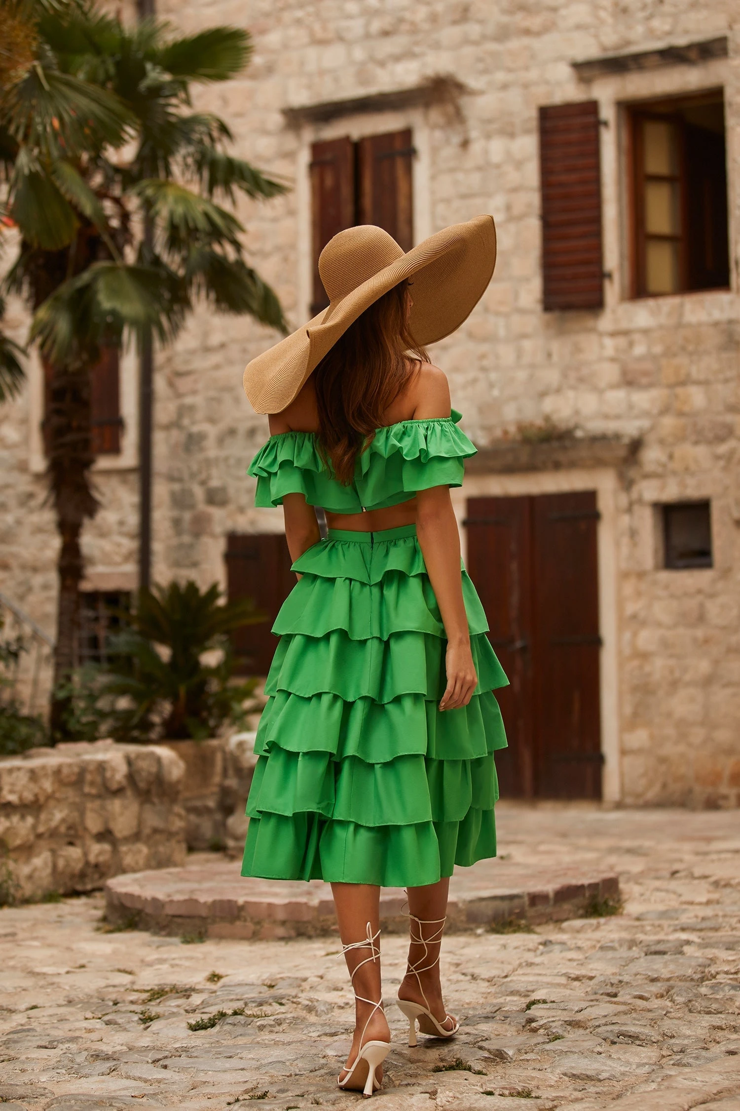 Indulge in maximalism courtesy of the Tia Set. In a bright emerald hue, with voluminous tiered ruffles, this two-piece set favours modernity. Designed with off-shoulder sleeves and an a-line skirt.